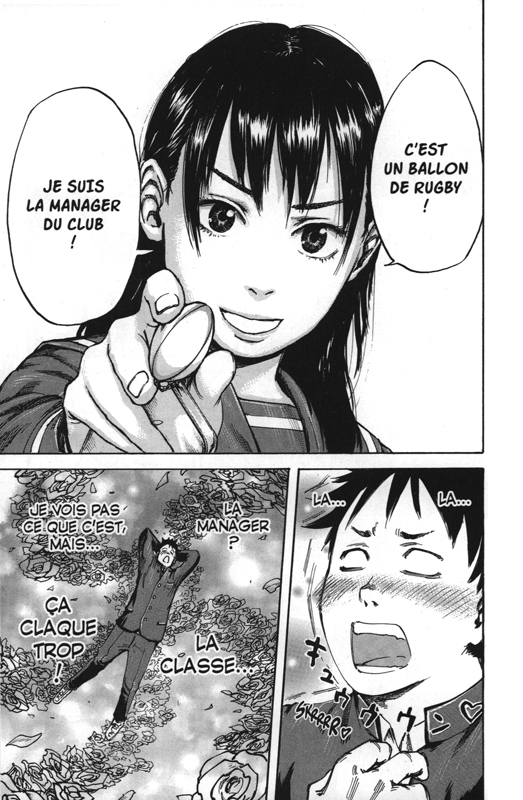 On a donc affaire ici à un shônen sportif qui semble reprendre tous les codes du genre : sport, apprentissage et comédie. Hino a une attitude désopilante la plupart du temps et surtout, ses aptitudes sportives sont proches du néant ! Heureusement qu'il semble doué en plaquage (vous comprendrez quand vous lirez le tome !) mais on se demande quand même comment il va pouvoir se faire une place dans l'équipe... Vous l'aurez compris, Hino est une sorte de anti-héros qui devrait nous surprendre au fil des tomes.