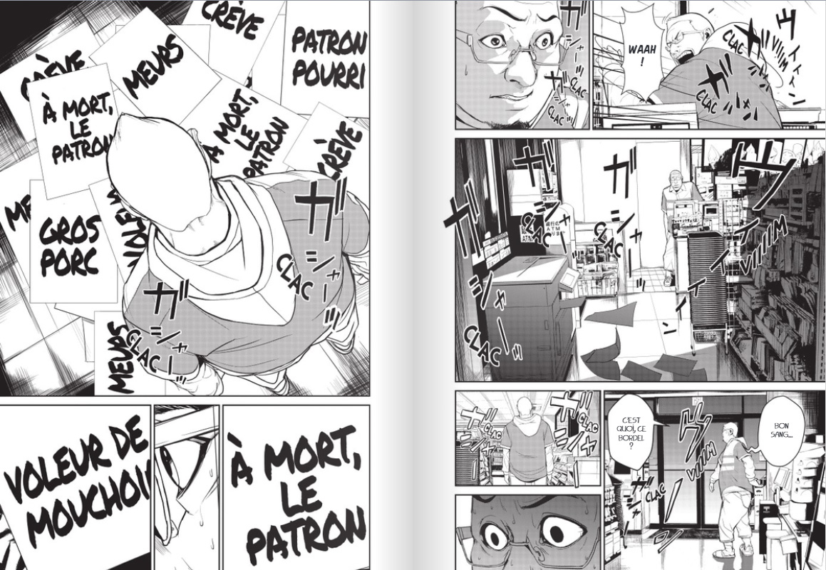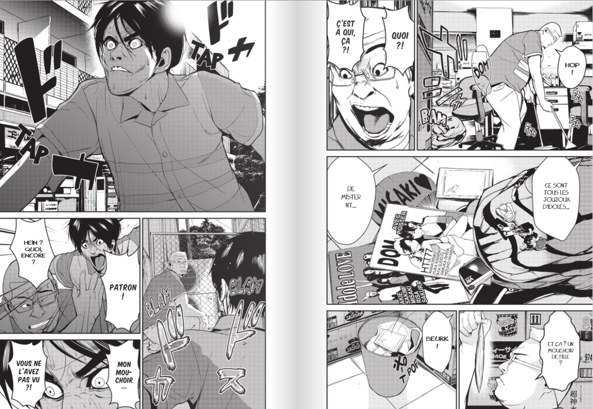 Alors oui, je vous l'accorde, tout ça est expédié en quelques pages et c'est invraisemblable. De plus, on n'a aucune explication supplémentaire mais tant pis, l'auteur se lance dans un thriller sur cette base et bizarrement, ça fonctionne plutôt pas mal ! Dès la scène suivante, l'auteur nous fait une petite démonstration de ce que peut réaliser Nasu en se vengeant de son exécrable patron. On ne va pas se mentir, c'est primaire mais tellement jouissif ! Les caméras de surveillance qui se tournent vers lui, la musique du magasin qui passe une chanson du groupe d'idoles, l'imprimante qui rejette des messages haineux à destination du patron... La mise en scène est parfaite, c'est très bien vu !