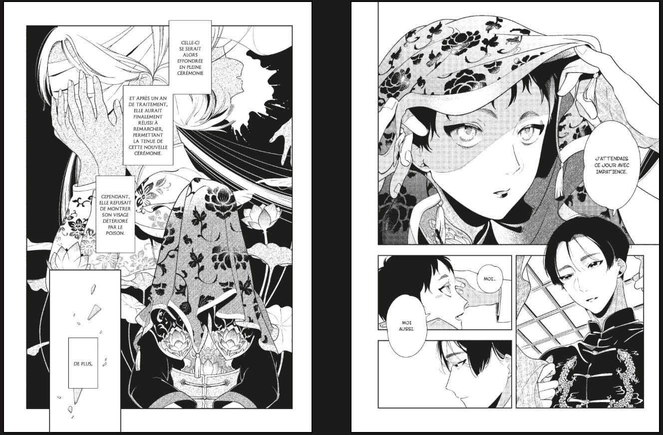 Provenant lui aussi des éditions japonaises Libre, Sous le linceul de la mariée, nous entraîne le temps d'un oneshot dans une superbe ambiance poisseuse et malaisante s'inspirant du folklore chinois avec une romance interdite lourde de secrets. Si vous aimez Les carnets de l'apothicaire et ses histoires d'empoisonnements et de jalousie au sein du harem, vous trouverez ici de jolies similitudes.
