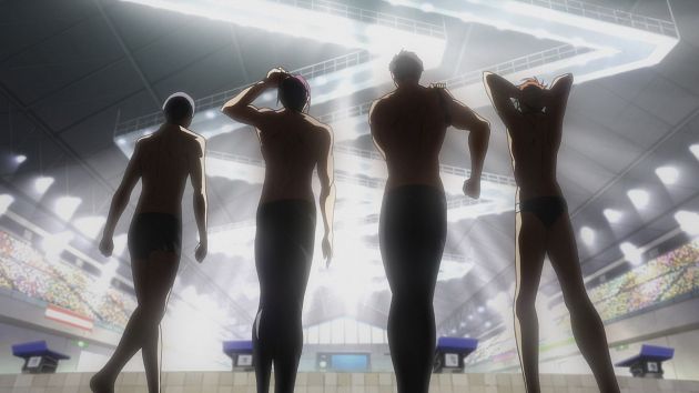 Indéniablement, les points forts de Free ! sont ses graphismes et son animation, tous deux de haute volée. L'inspiration côté chara-design est probablement un poil classique (je pense notamment à Haikyuu !! pour la comparaison) et les visages ont assez peu de relief (contrairement aux corps, point sur lequel je reviendrais dans quelques instants) mais l'animation compense largement ce fait (vous remarquerez que je n'ai pas dit « faiblesse »). Du générique d'ouverture (qui a une classe immense au passage) au générique de fin, il n'y a aucun moment de faiblesse visuelle ou technique.