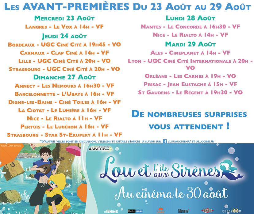 Alors que le film d'animation de Lou et l'île aux sirènes de Masaaki YUASA (The Tatami Galaxy) sort le 30 août au cinéma, des avant-premières vont être diffusées dans toute la France :