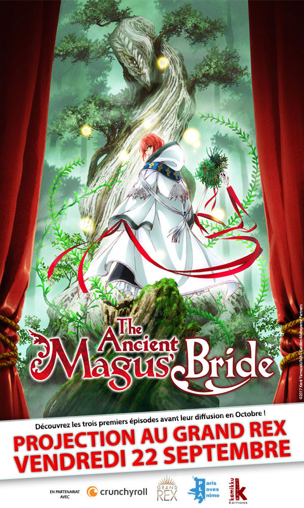 Voilà qui va faire plaisir à tous les fans parisiens de la série de Kore YAMAZAKI : les 3 premiers épisodes de la série TV animée The ancient magus bride seront diffusés en avant-première au cinéma le Grand Rex à Paris le 22 septembre 2017 à 20h00.