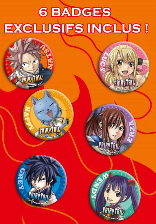 - Un set de 6 badges inédits à l’effigie des personnages charismatiques de Fairy Tail : Natsu, Lucy, Happy, Erza, Grey et Wendy.