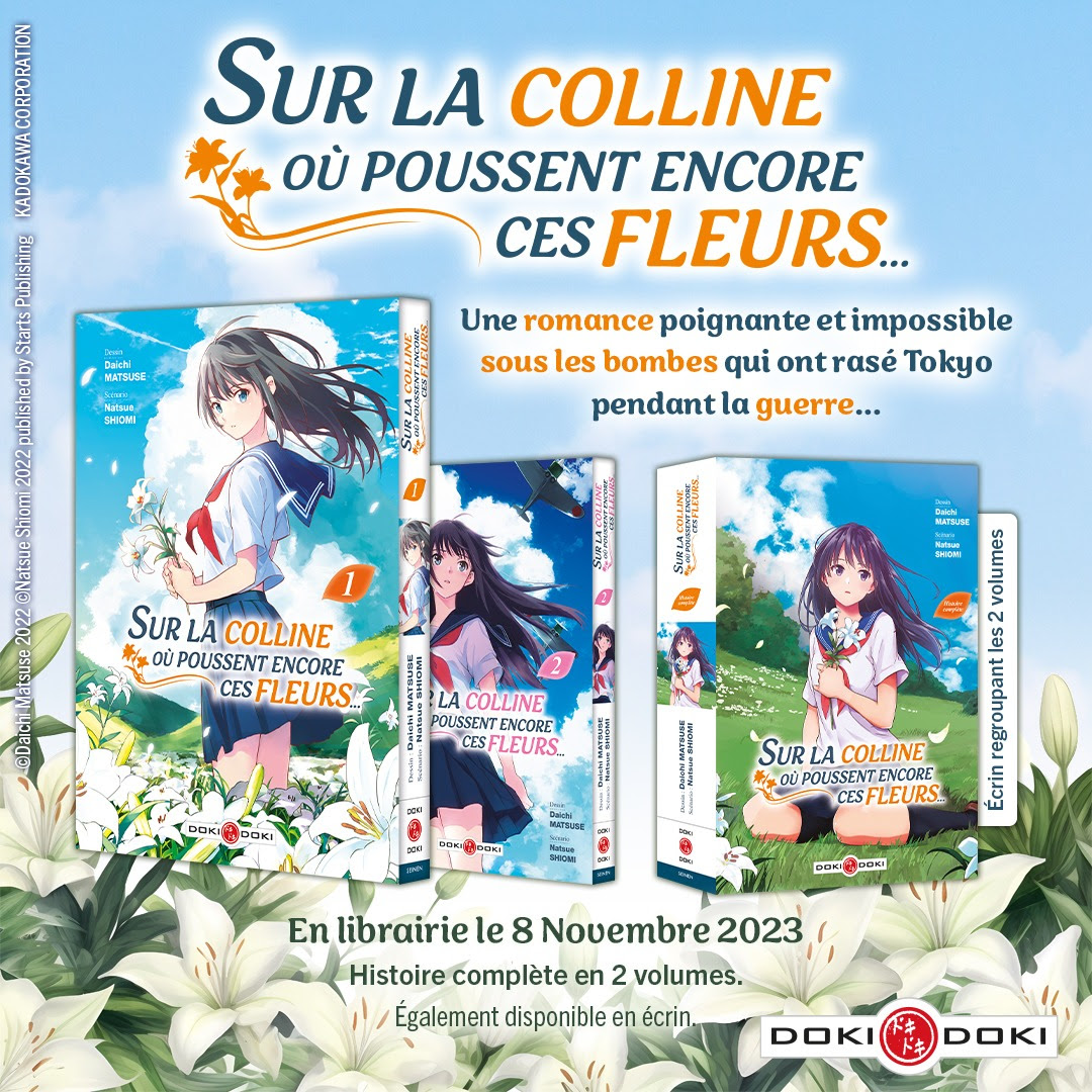 Doki-Doki est ravi d'annoncer l'arrivée d'une nouvelle série courte à son catalogue : Sur la colline où poussent encore ces fleurs... de Daichi MATSUSE et Natsue SHIOMI. Cette romance poignante et impossible sous les bombes qui ont rasé Tokyo pendant la guerre, est terminée en 2 tomes et sortira dès le 8 novembre prochain. Elle sera proposée à l'unité au prix de 7,95€ ou dans un écrin intégrale à 15,90€. En France, Daichi MATSUSE est déjà connu pour ses travaux sur Rendez-vous au crépuscule et Re:Zero Premier Arc et Troisième Arc.